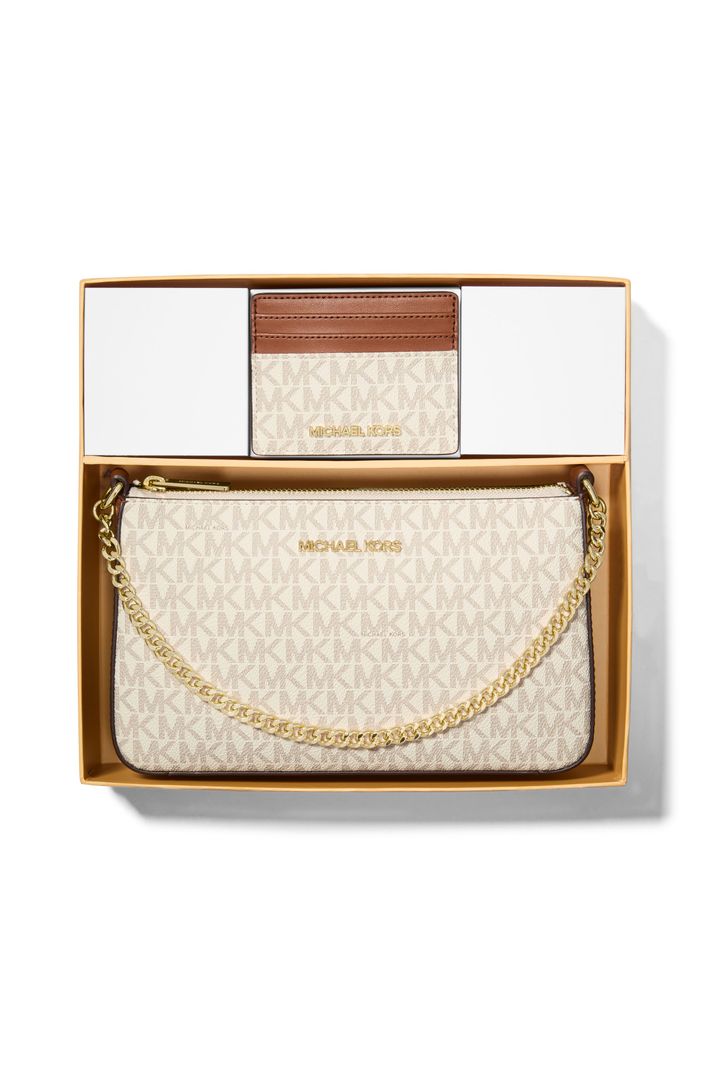 Elegantemente embalado em nossa embalagem sofisticada, este conjunto de presente em lona com estampa Signature é o duo perfeito para presentear. A bolsa possui uma alça de pulso destacável com detalhe em corrente, oferecendo versatilidade de estilo, e abre para um interior espaçoso para os itens essenciais. Coloque o porta-cartões no design combinando ou use-o sozinho em dias que exigem praticidade.